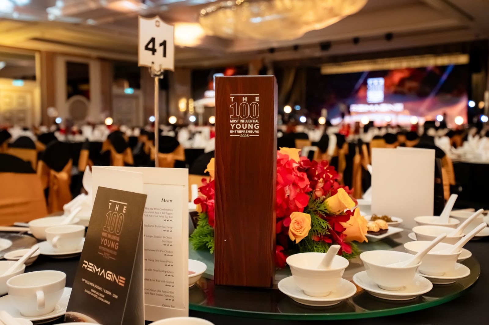 100MIYE Awards table setup, featuring the official “100 Most Influential Young Entrepreneurs” centrepiece.