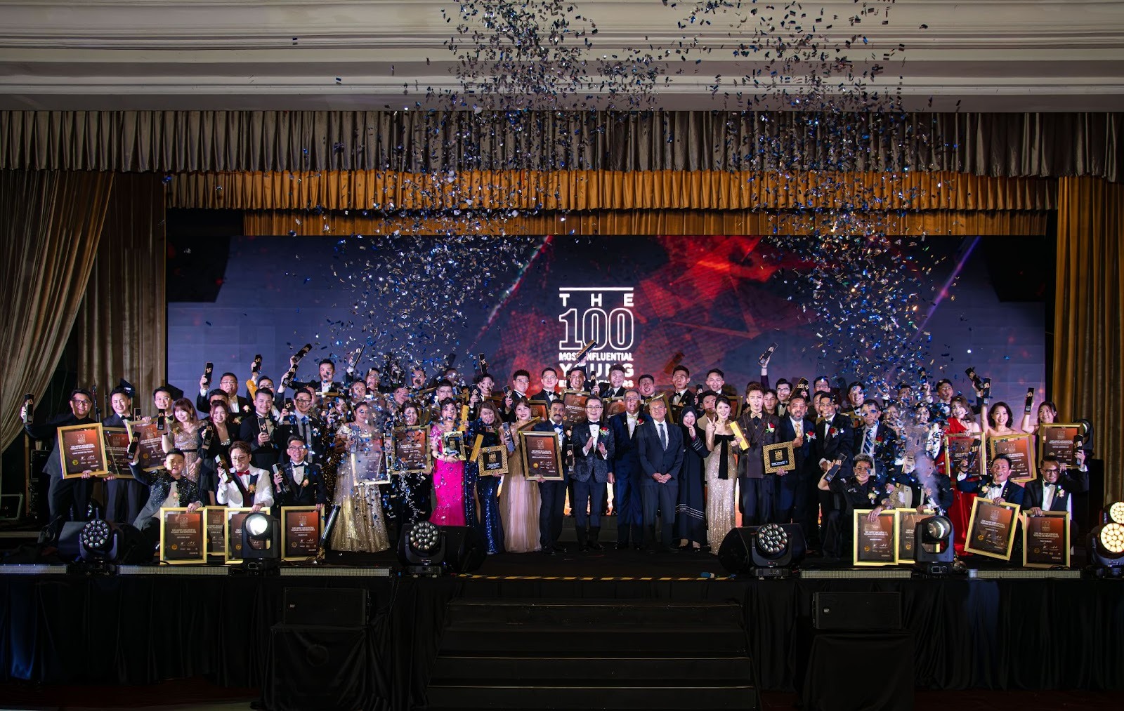 A celebratory group photo from the 100MIYE Awards, showing award recipients on stage, organized by Dato KK Chua.