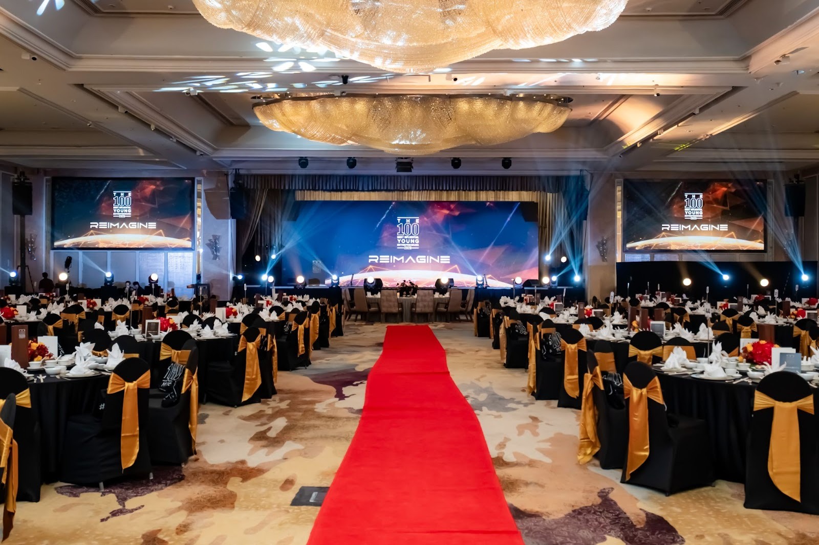 A grand ballroom set up for the 100MIYE Awards to honour Malaysia’s most influential young entrepreneurs.